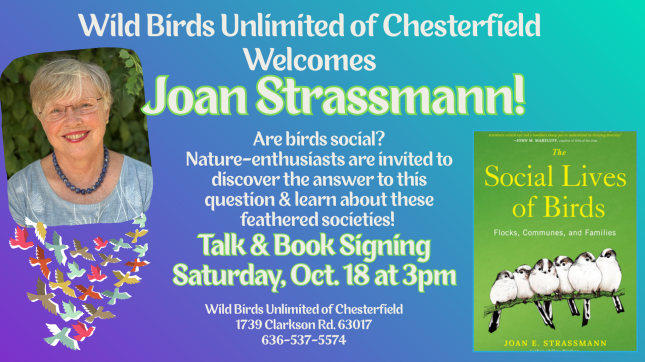 behavior and professor of biology, Joan Strassman. Author of the engaging Slow Birding and The Slow Birding Journal, Strassman will introduce us to the world of bird societies and discuss her newest book, The Social Lives of Birds.