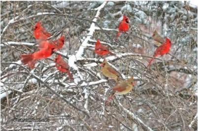 • Cardinals flocking; they're usually the first and last birds to be seen at feeders.